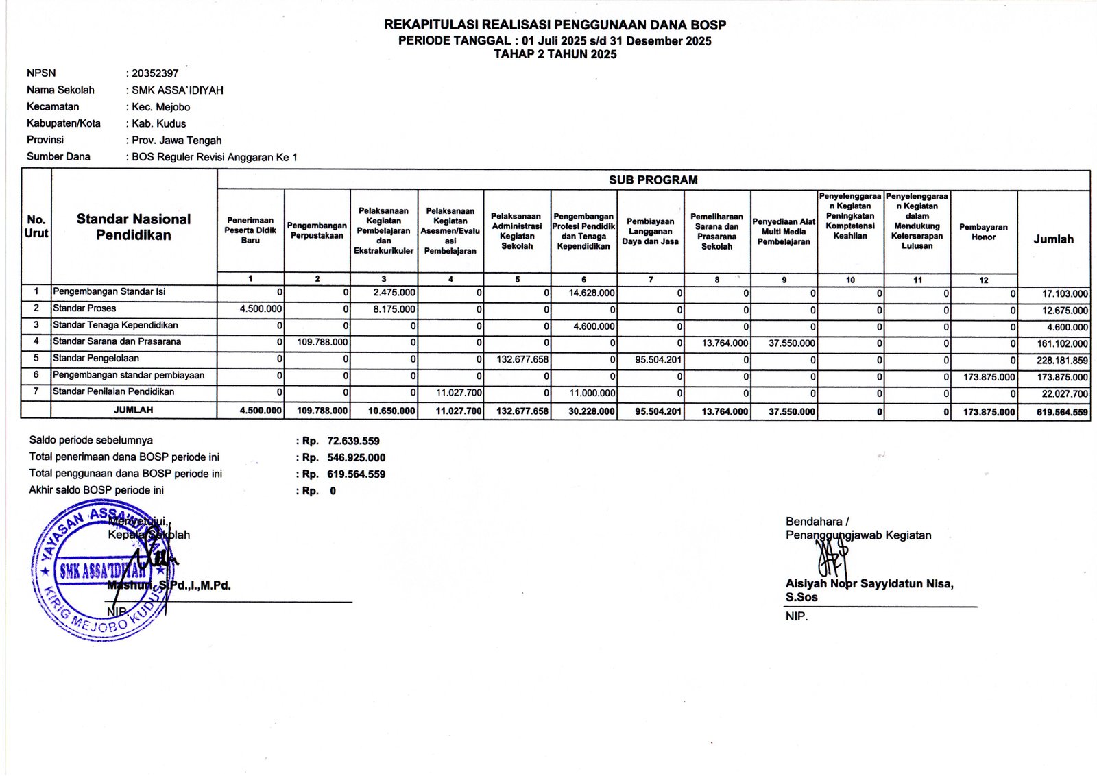 smkassa REKAPITULASI REALISASI PENGGUNAAN DANA BOSP REGULER TAHAP 2 SMK ASSA`IDIYAH KUDUS TAHUN 2025 Posted on Desember 29, 2025